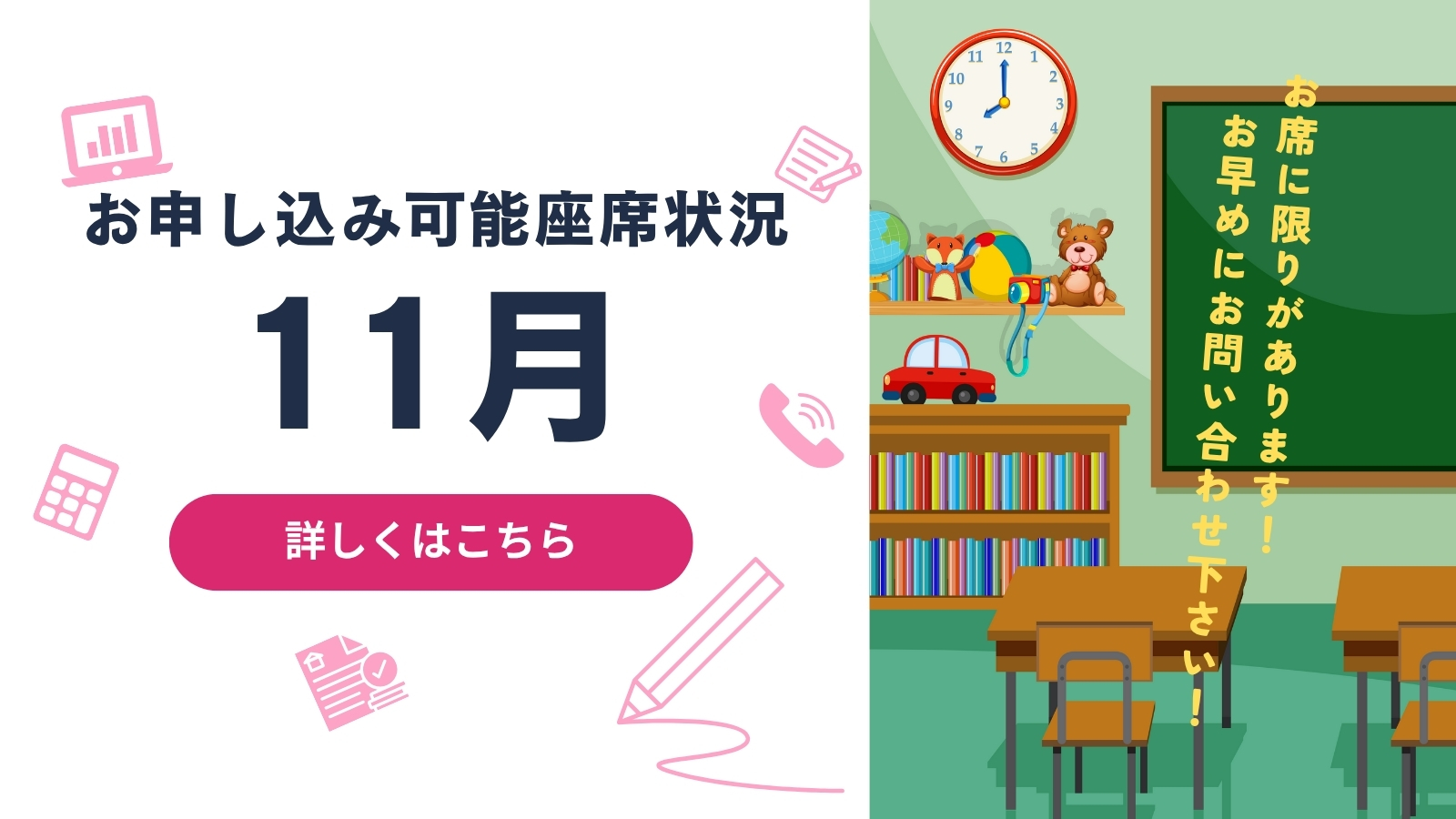受付時間:平日14時〜22時・土曜日13時〜20時 (日曜日・毎月第5週目休校)