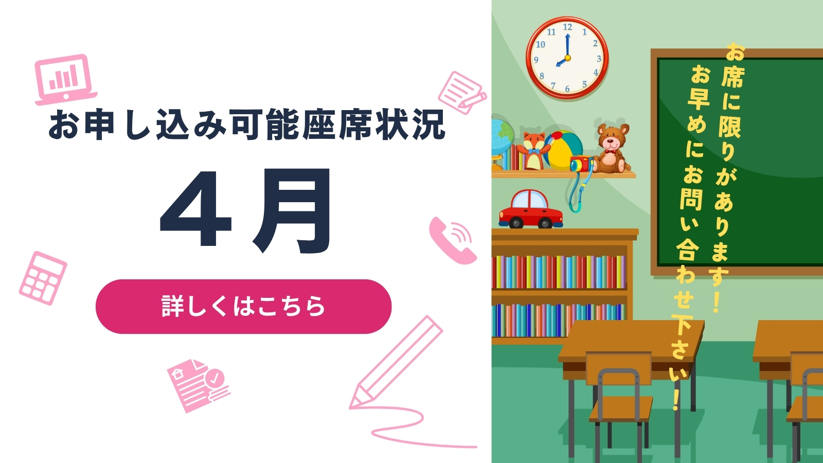 受付時間:平日14時〜22時・土曜日13時〜20時 (日曜日・毎月第5週目休校)